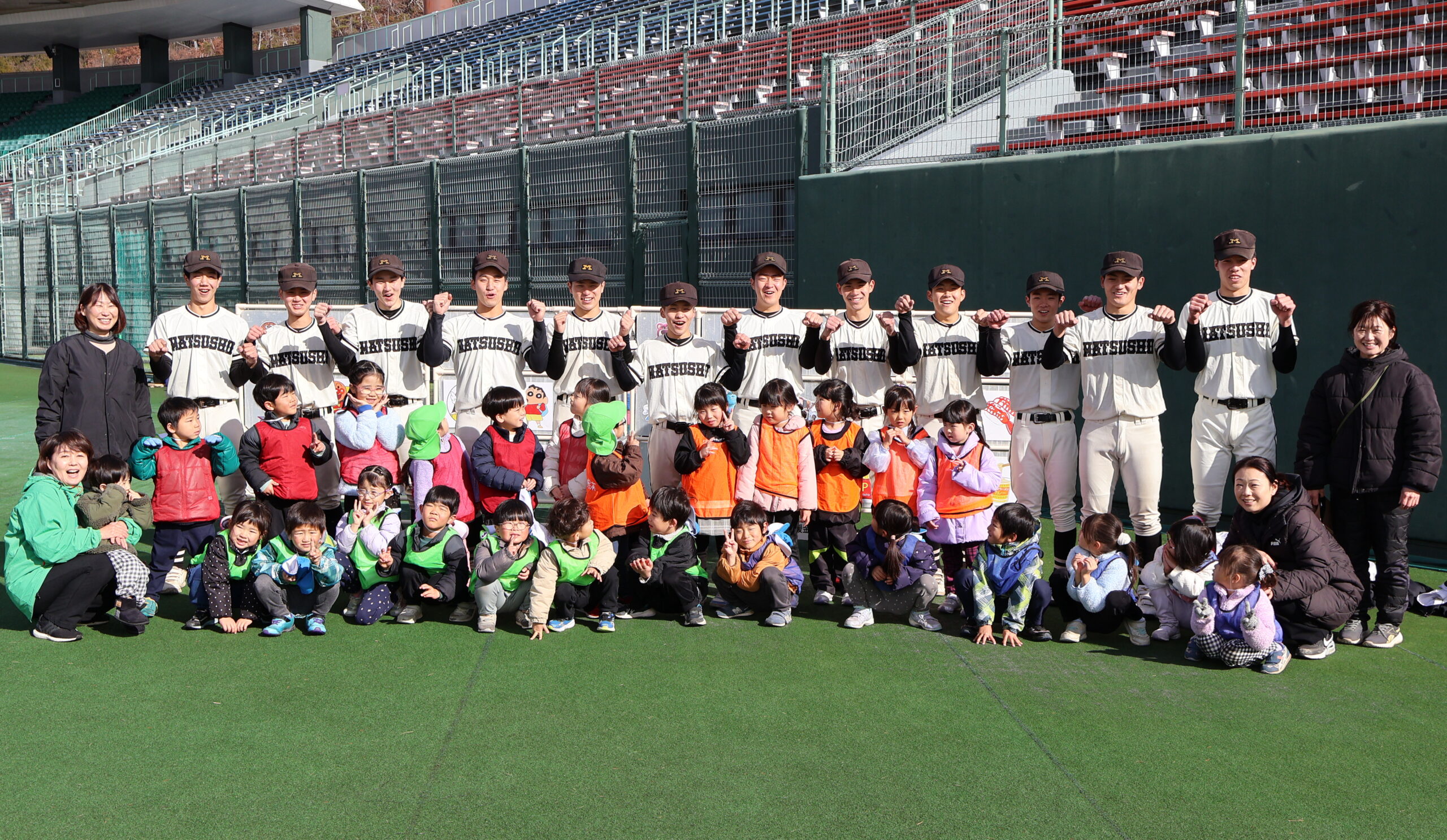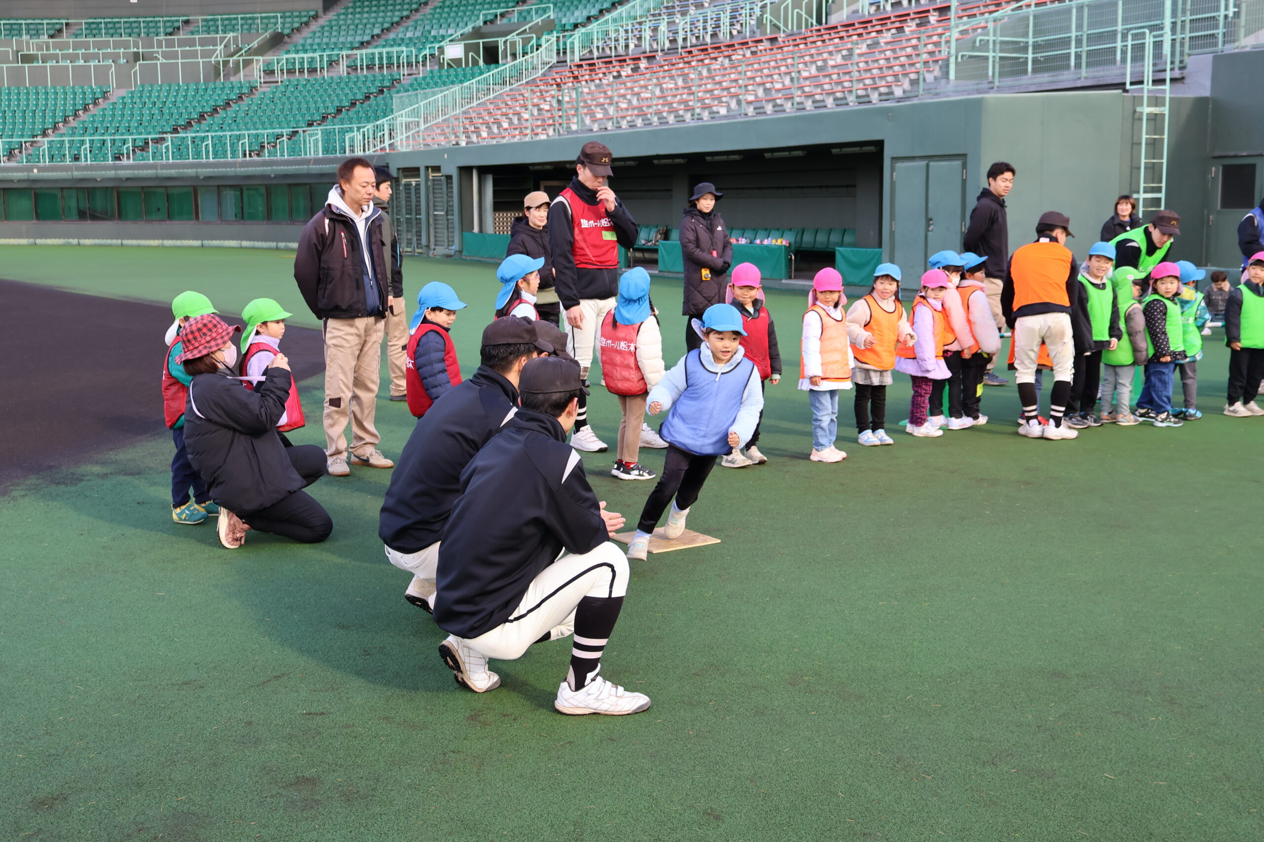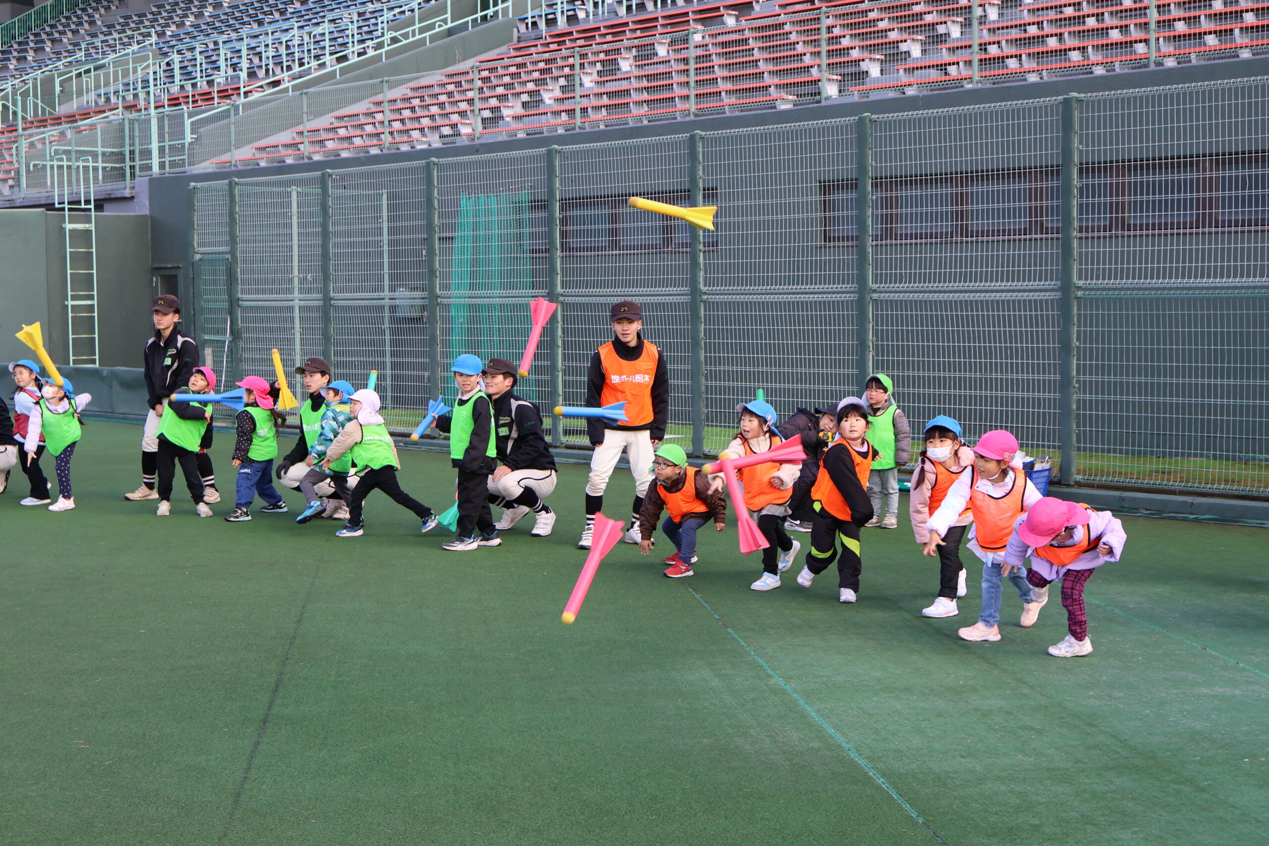 広々としたスタジアムのグラウンドで行われた体験活動に、園児たちは元気いっぱいに体を動かし、ボールを追いかける姿が多く見られました。初めて本格的な球場に立つ園児も多く、終始、笑顔と歓声に包まれた時間となりました。