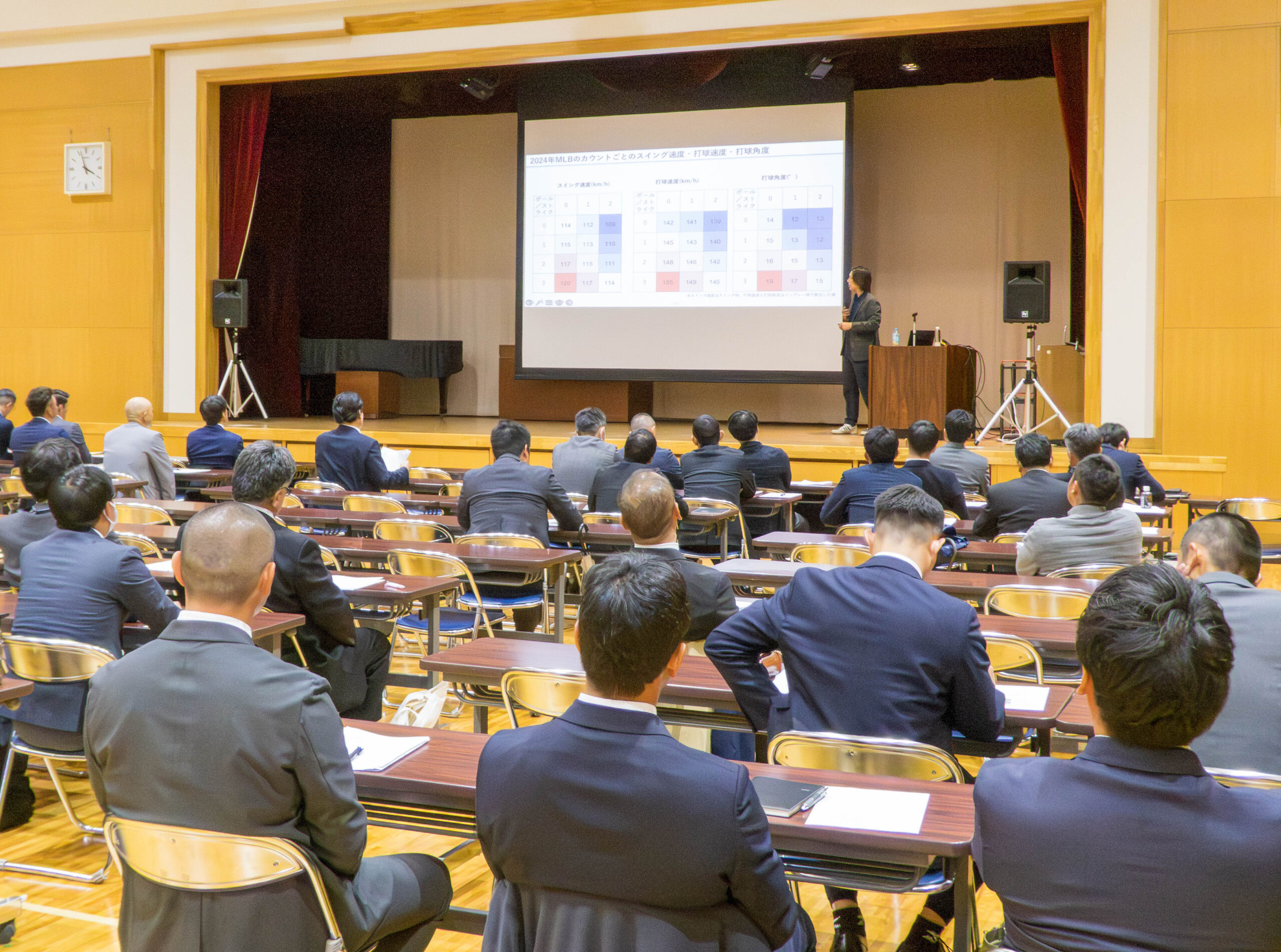 講演では、投球・打球データの見方をはじめ、球速、球質、回転数、回転軸、ボール変化量などについて、具体的なデータをもとに解説していただきました。また、長野県の高校生投手の傾向や、身体づくり・パワー発揮の重要性についても紹介され、日々の練習や選手育成につながる多くの学びがありました。